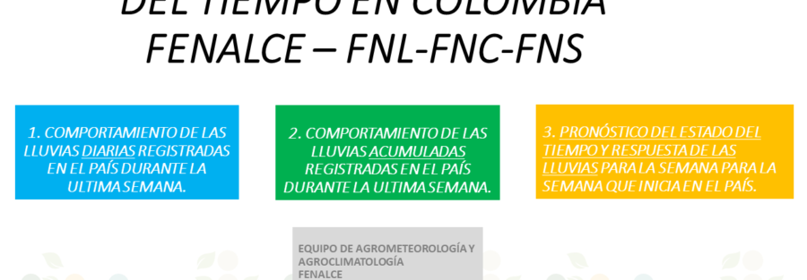 Un cordial saludo para todos, La Federación Nacional de Cultivadores de Cereales, Leguminosas y Soya – FENALCE y sus diferentes fondos (FNL-FNC-FNS) tienen el gusto de compartir el comportamiento del estado del tiempo dentro del territorio nacional durante la semana pasada y los diferentes pronósticos del estado del tiempo a nivel nacional, siendo este insumo una herramienta que brinda información de posibles alteraciones en el régimen climático y propone recomendaciones para los diferentes cultivos que pueden ser vulnerables ante la variabilidad climática.