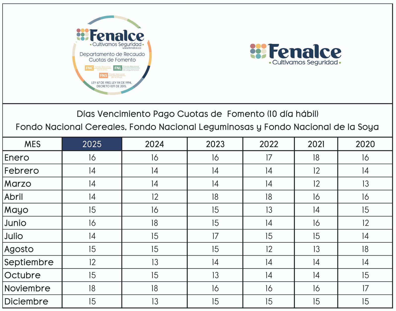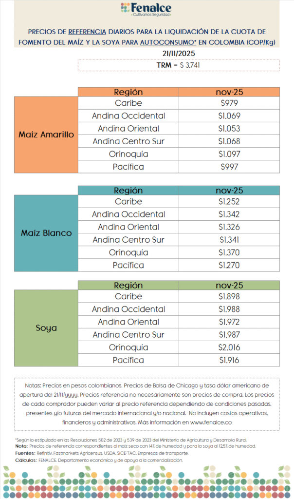 Los precios diarios de referencia para la liquidación de la Cuota de Fomento por autoconsumo del Fondo Nacional de Cereales, Fondo Nacional de Leguminosas y Fondo Nacional de Fríjol Soya, son reglamentados por el Ministerio de Agricultura y Desarrollo Rural en las resoluciones No. 502 y 539 de diciembre de 2023, que regirán para el primer semestre de 2024